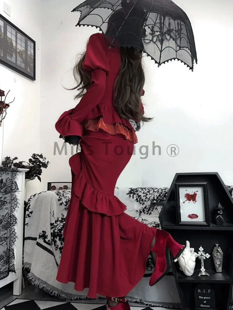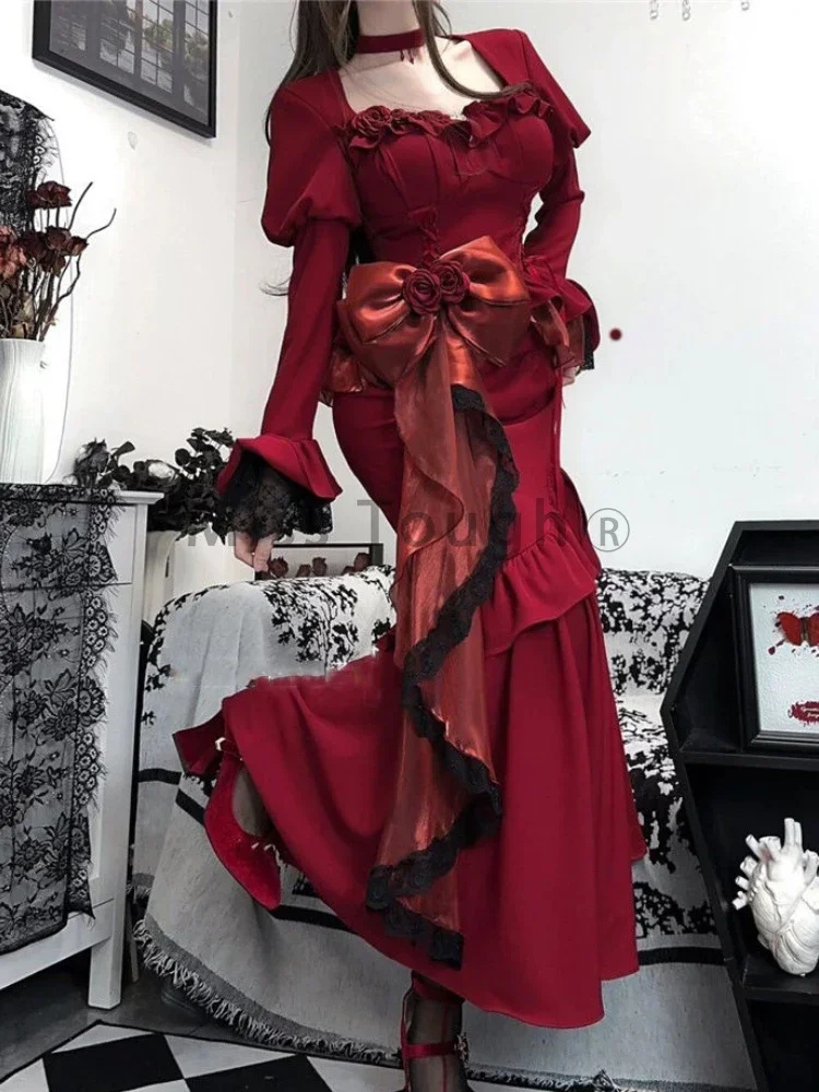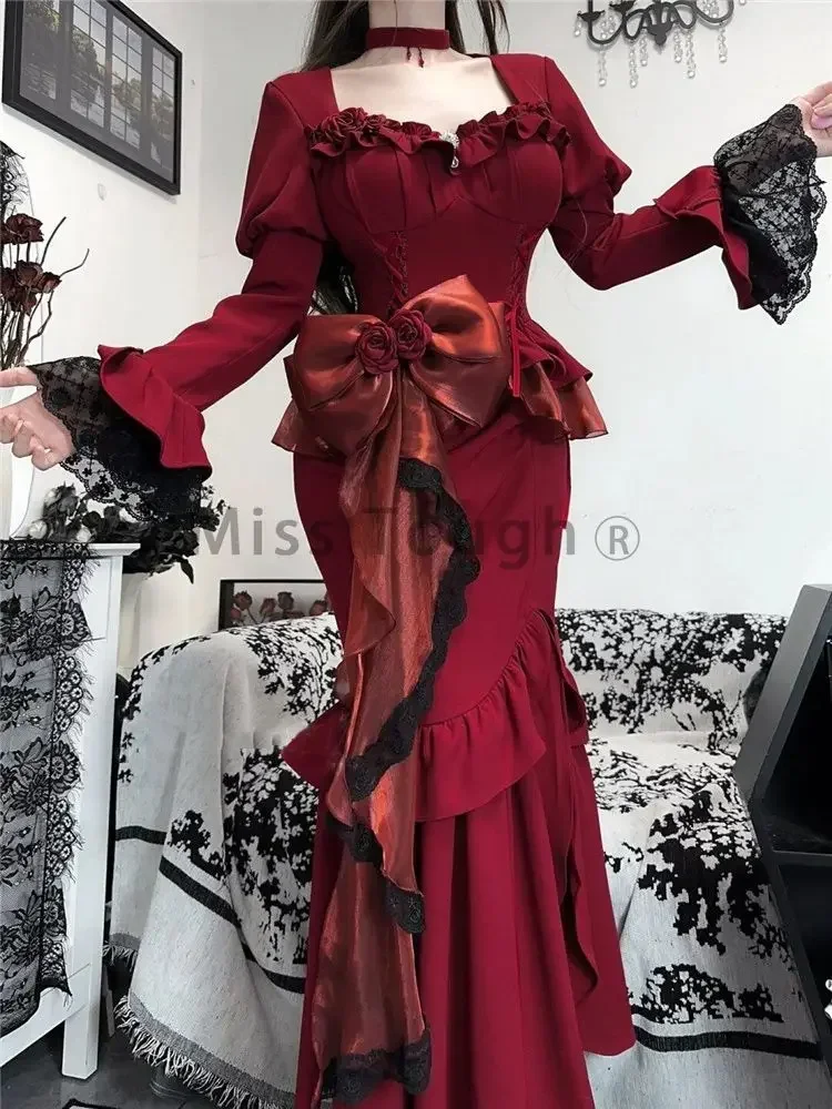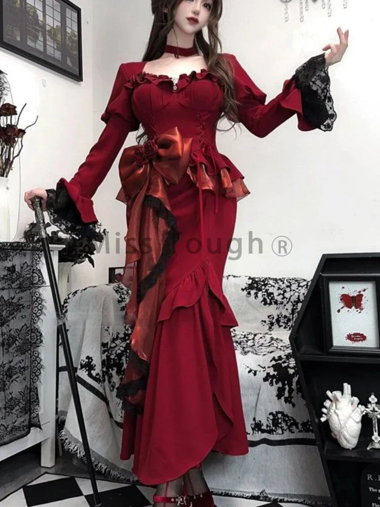 Autumn Red Vintage Lace Long Sleeve Chic Midi Evening Party Dress 2025