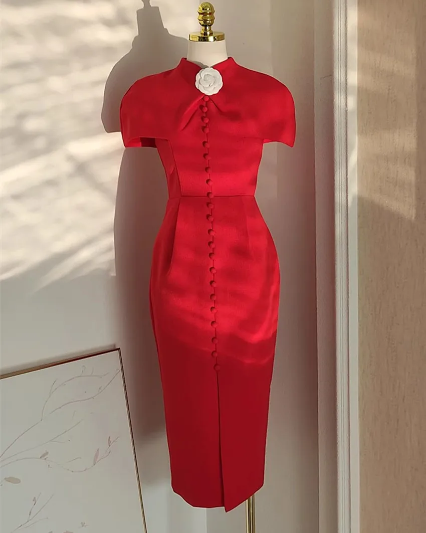 The standout feature of this dress is the floral appliqué decoration, which adds a touch of delicacy and artistry to the bold red color, making it perfect for occasions where you want to shine. Whether you’re attending a formal gathering or a celebratory evening, this dress will make sure you’re the center of attention.