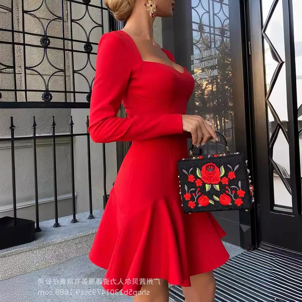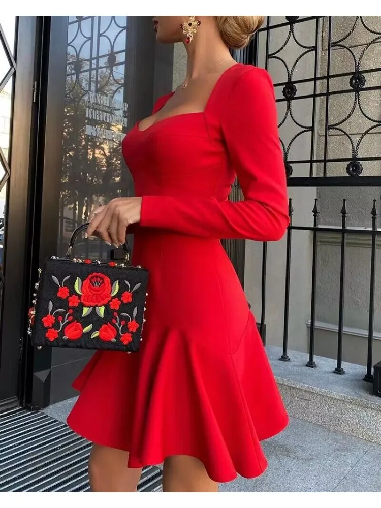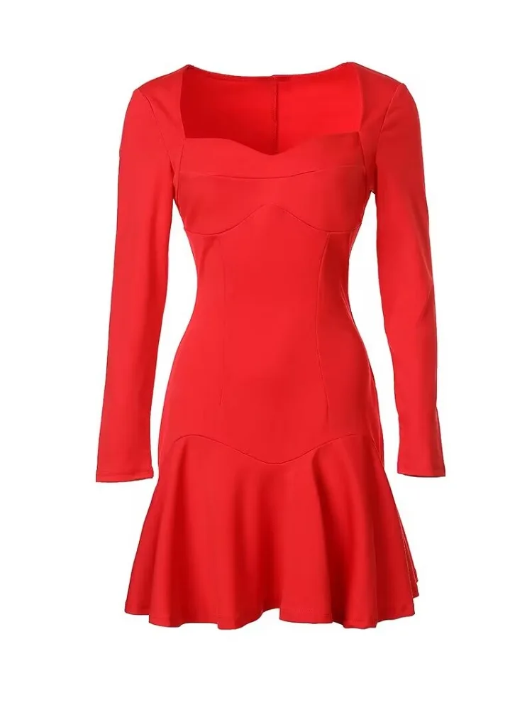 Chic red homecoming dresses featuring a slim-fit, high waist, long sleeves, and a sexy square collar for a stylish look.