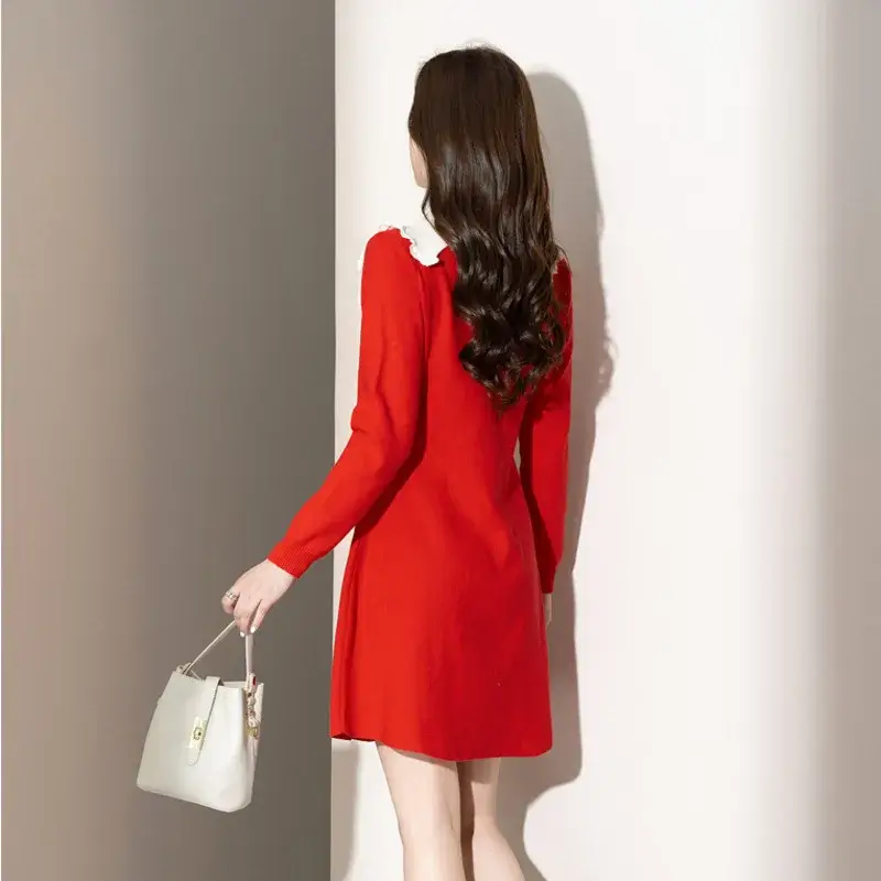 Red Knitted A-Line Sweater Dress With Peter Pan Collar And Long Sleeves: The Perfect Mix of Comfort and Elegance