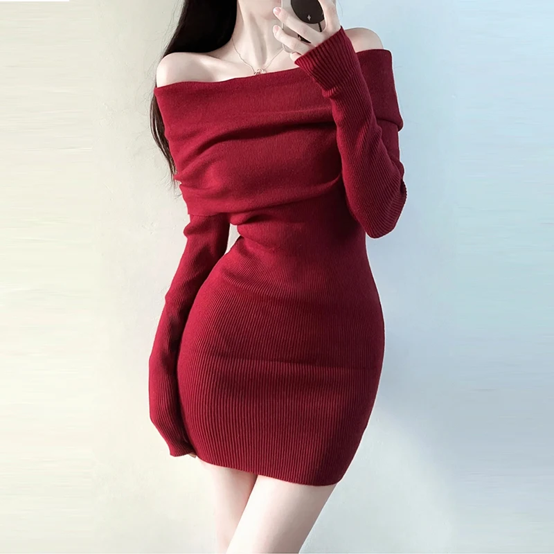 Red Sexy Off-Shoulder Sweater Dress Long Sleeve Slim Waist Knitted: Perfect for Every Occasion