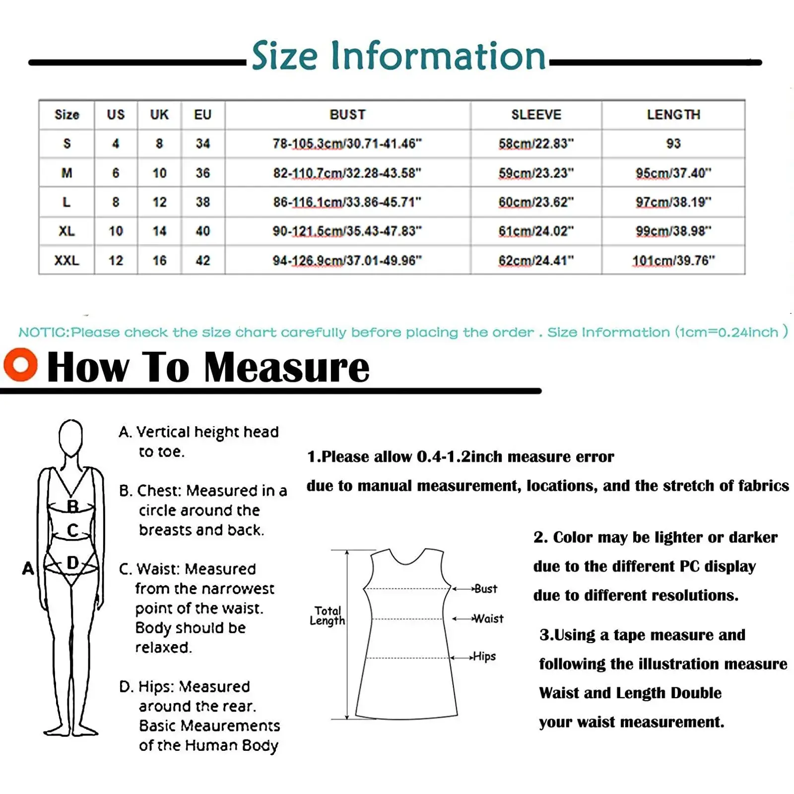 Size:XXL US:12 UK:16 EU:42 BUST:94-126.9cm/37.01-49.96” SLEEVE:62cm/24.41” LENGTH:101cm/39.76”